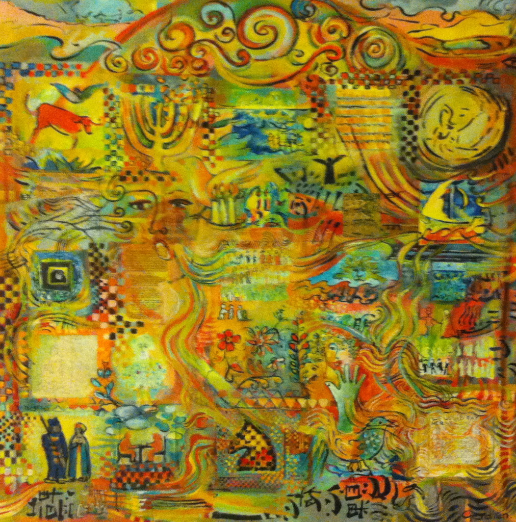 verzameling van tekeningen ..etsjes.....foto`s....met elkaar verbonden door kleur .................het kabinet van mijn oma waar vanalles in te vinden was en werd bewaard. ........................................... we are all ilands in a commen sea..............