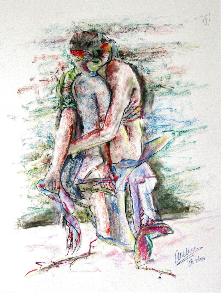 Bang dat hij is om van zijn voetstuk gestoten te worden zit De Mens ermee dat hij toch kan worden verleid door De Slang die ons mee wil nemen naar het nivo waar onze tenen het gevoeligst zijn. Door Baruch vertaald .. Seated on a pedestal mankind is afraid that serpents tantalize his toes and tumbling is his fate