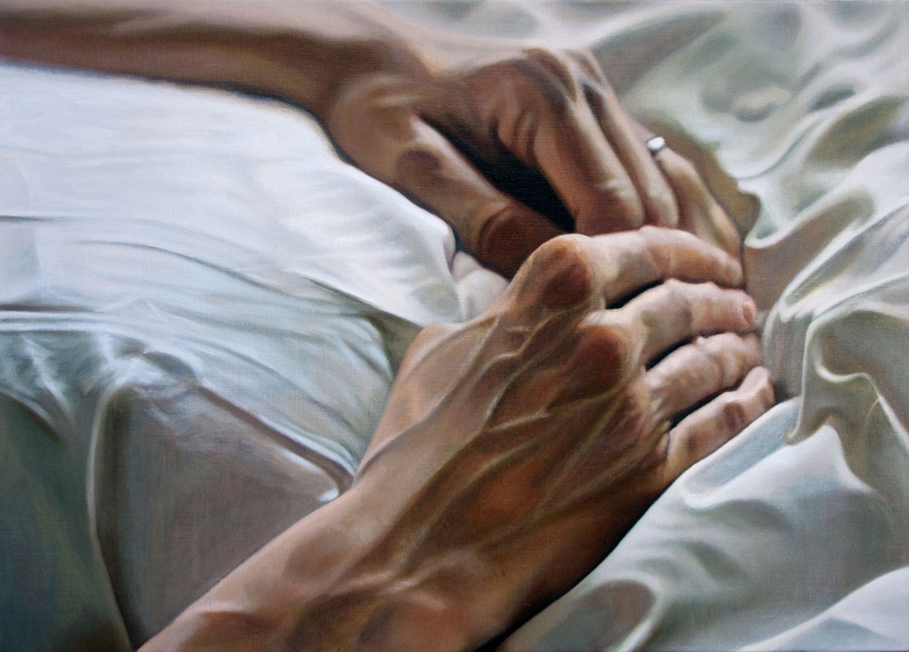 Mensen Figuratie Groen Vrouw Portret Man Art Media Woman Realistisch Kunst Oilpainting Portrait Olieverfschilderij Green Vervreemding Handen Hands Dood Realisme Realism Bed Paint Ziekte Communicatie