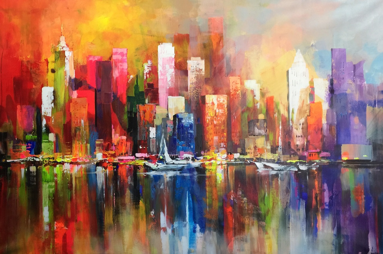 Schilderij Water Painting Colours City Skyline