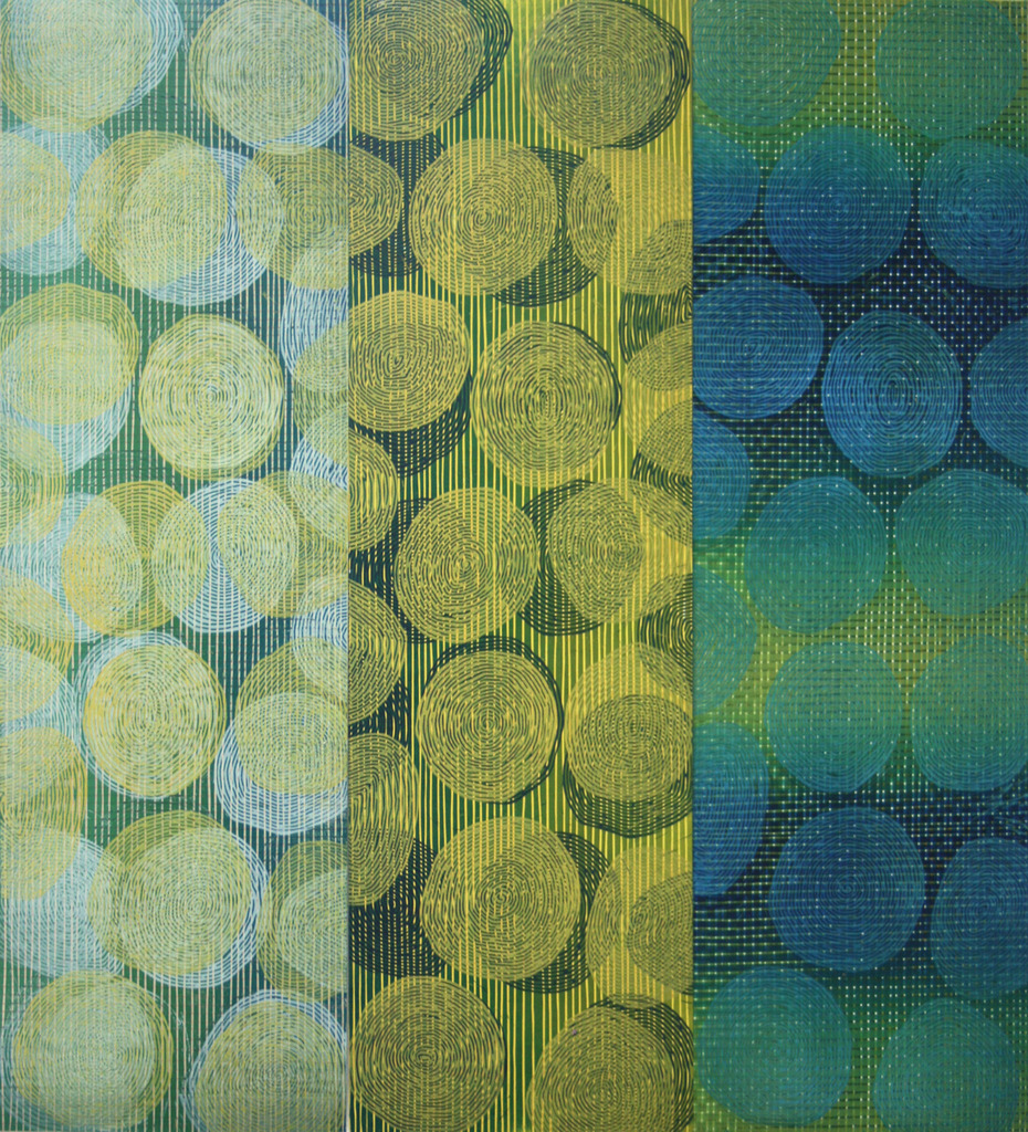 Linosnede, drieluik, gedrukt op hahnemule en verlijmd op aluminium. Meerdere drukgangen, unieke druk zonder oplage. Ritme en herhaling.