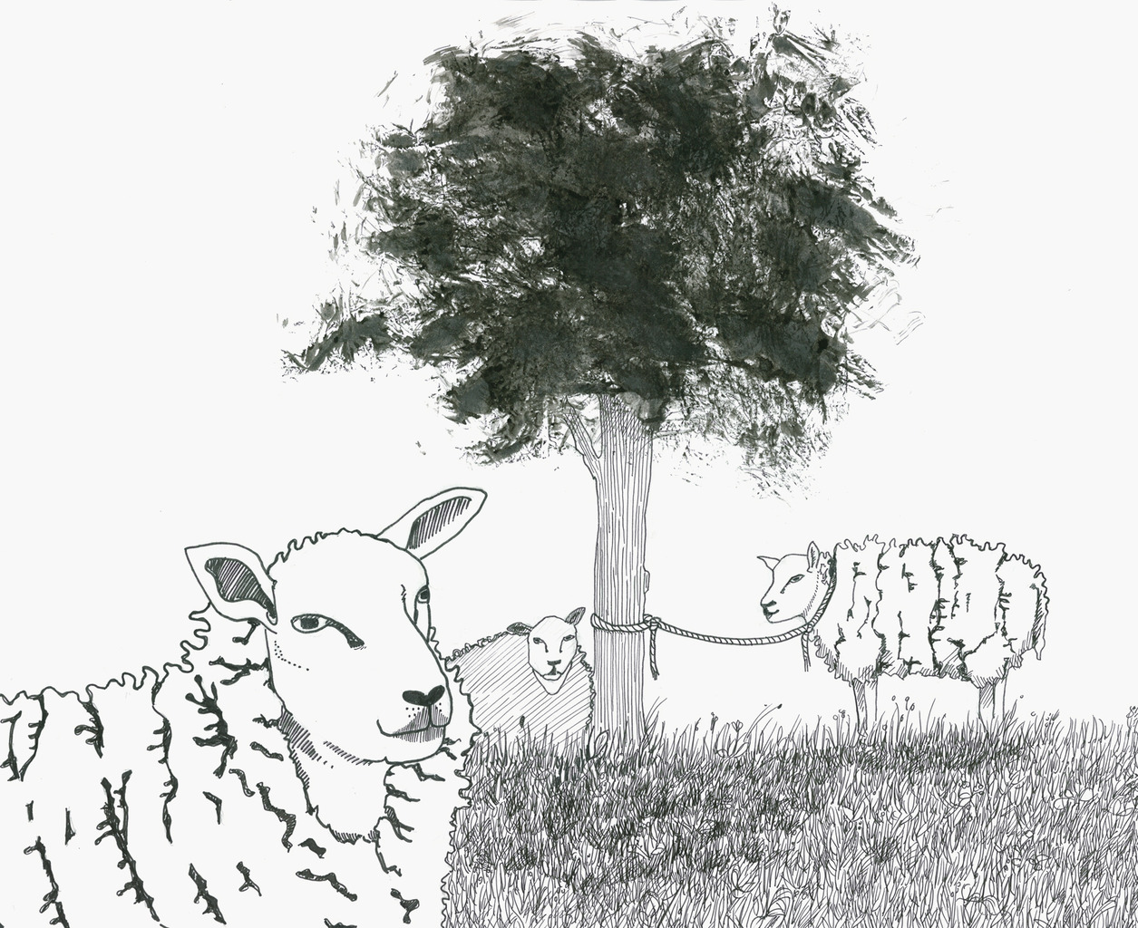 Schapen bij een boom.
