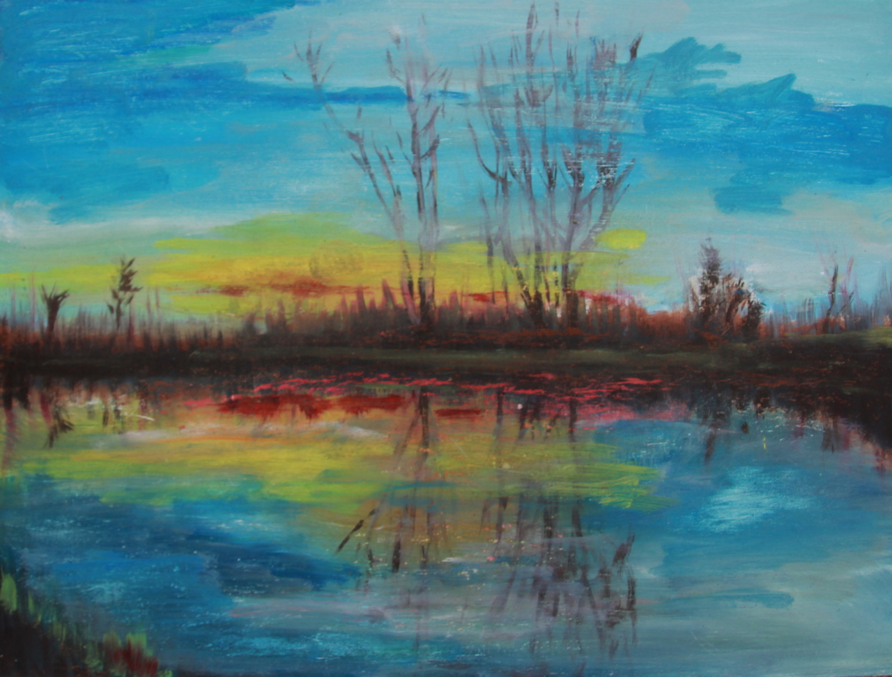 Schildering van ondergaande zon met spiegeling in het water,