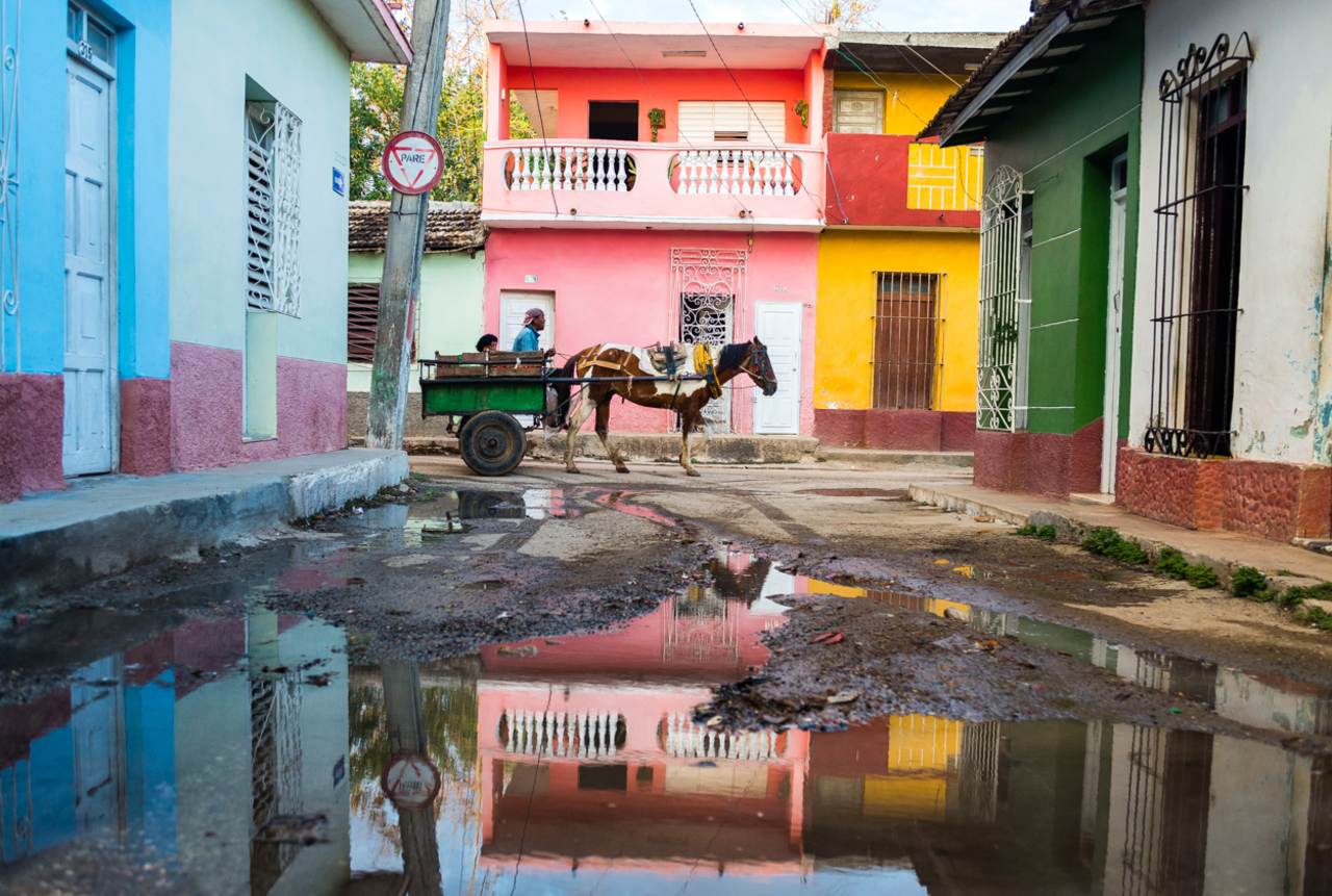 Kleuren En Paard Reflectie Straat Plassen Wagen Cuba Straatfotografie Trinidad Straatfotograaf Straatfoto