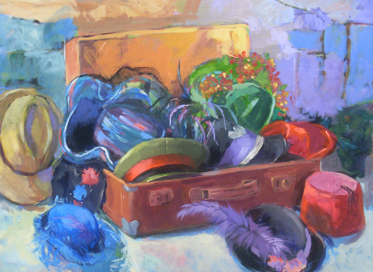 Verkleedkoffer met hoedjes acryl op doek