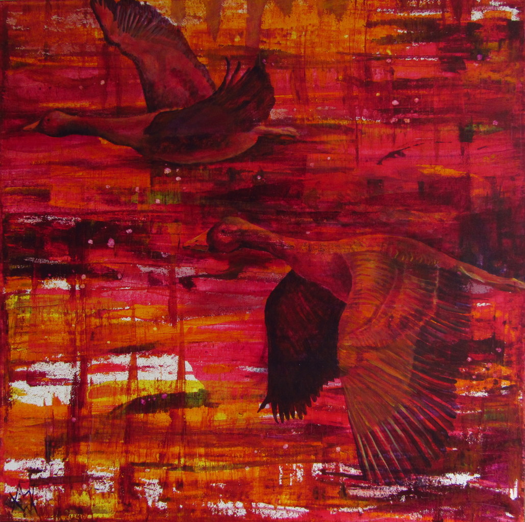 Hier heb ik eerst een abstracte ondergrond gemaakt. Daarin "zag" ik een avondzon op water, vandaar dat het idee van overtrekkende ganzen ontstond!