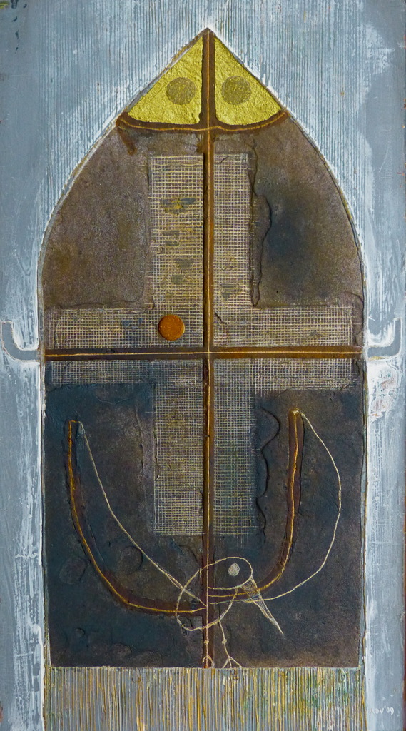 Zand en karton op grijs paneel. Krassen en snijden met els en stanleymes. Toegevoegde verfkleuren: wit en goud.