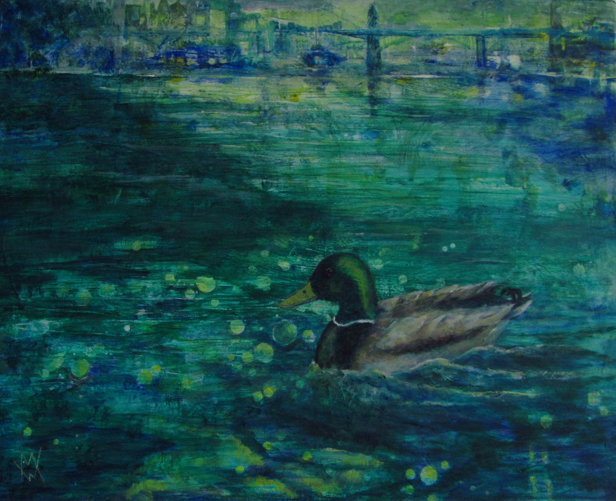 Blauw Acryl Groen Green Brug Rivier Eend Bleu River Bridge Duck Nijmegen Woerd Waal Mariandewit