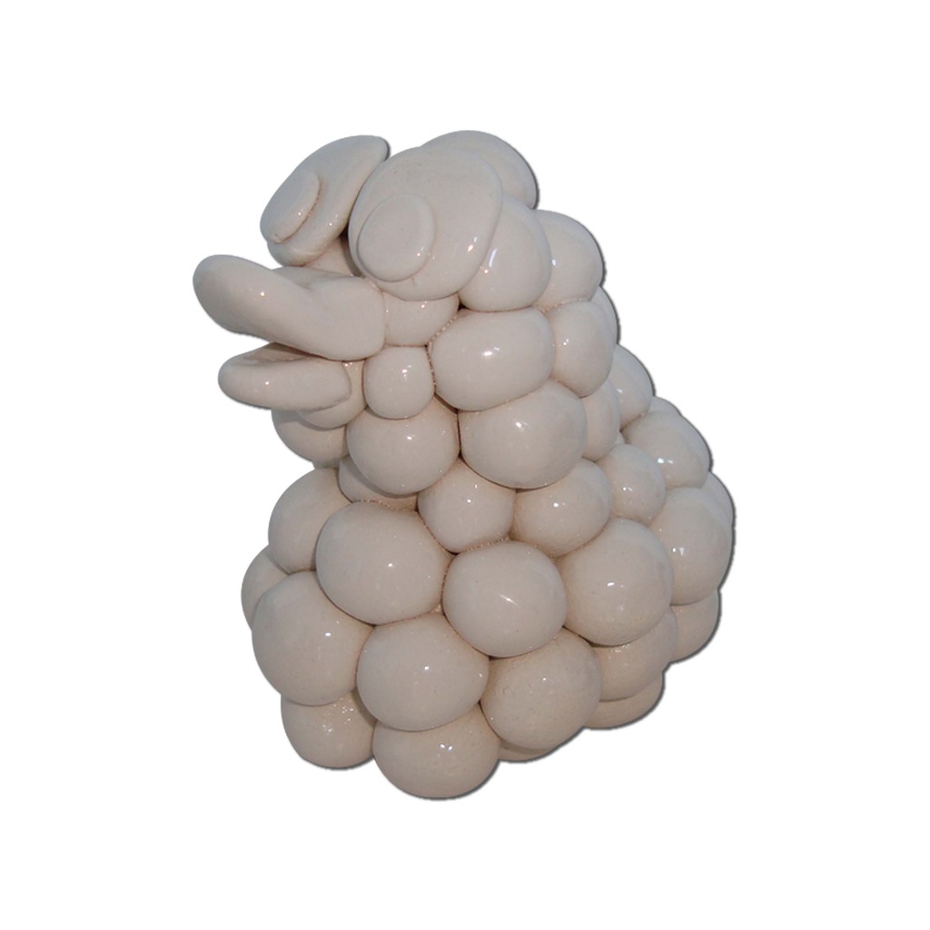 Werkwijze: Handmatig gerolde bolletjes en handmatig samengesteld. Materiaal: Witbakkende fijne chamotte klei. Deklaag: Wit glanzend.