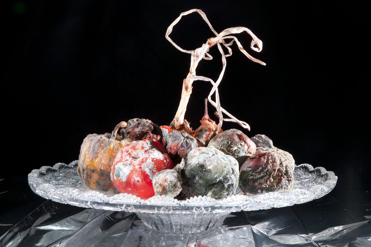 stilleven met bedorven fruit en een ui in kristallen schaal