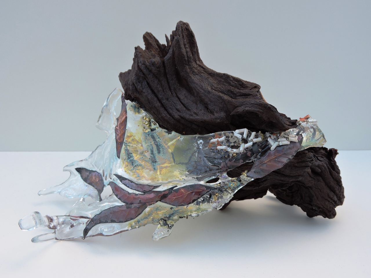 Glassculptuur verbeeldend ,water met daarin bladeren met veenhout. i.p.b.