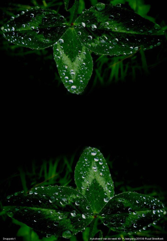 Na een regenbui blijven deze druppels achter op de bladeren. Een druppel is een kleine hoeveelheid vloeistof, die een bolvorm aanneemt wanneer de vloeistof volledig omhuld is door een vrije ruimte of op een vrij oppervlak ligt. Deze vorm ontstaat doordat de moleculen van de vloeistof elkaar aantrekken. Door dit verschijnsel (cohesie) rangschikken zij zich zo dicht mogelijk opeen, wat resulteert in de bolvorm. Eén druppel kan grote gevolgen hebben. Zoals de uitdrukking ‘dat is de druppel die de emmer doet overlopen’ aangeeft: het kan het laatste zetje zijn dat nodig is om een heftige reactie te veroorzaken. Of ‘men vangt meer vliegen met een druppel honing dan met een vat azijn’, oftewel: een vriendelijk woord heeft meer effect dan een lange, boze tirade. Of ‘een druppel op een gloeiende plaat’: een remedie die bij lange na niet voldoende is om een ongemak of gebrek te verhelpen.