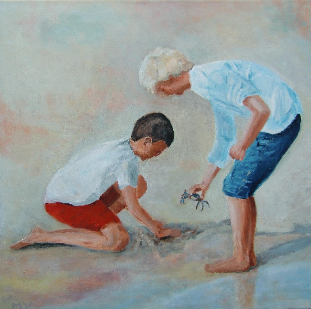 Floris en Oscar, druk bezig met krabbetjes vangen op het strandje op Oudeschild, Texel.