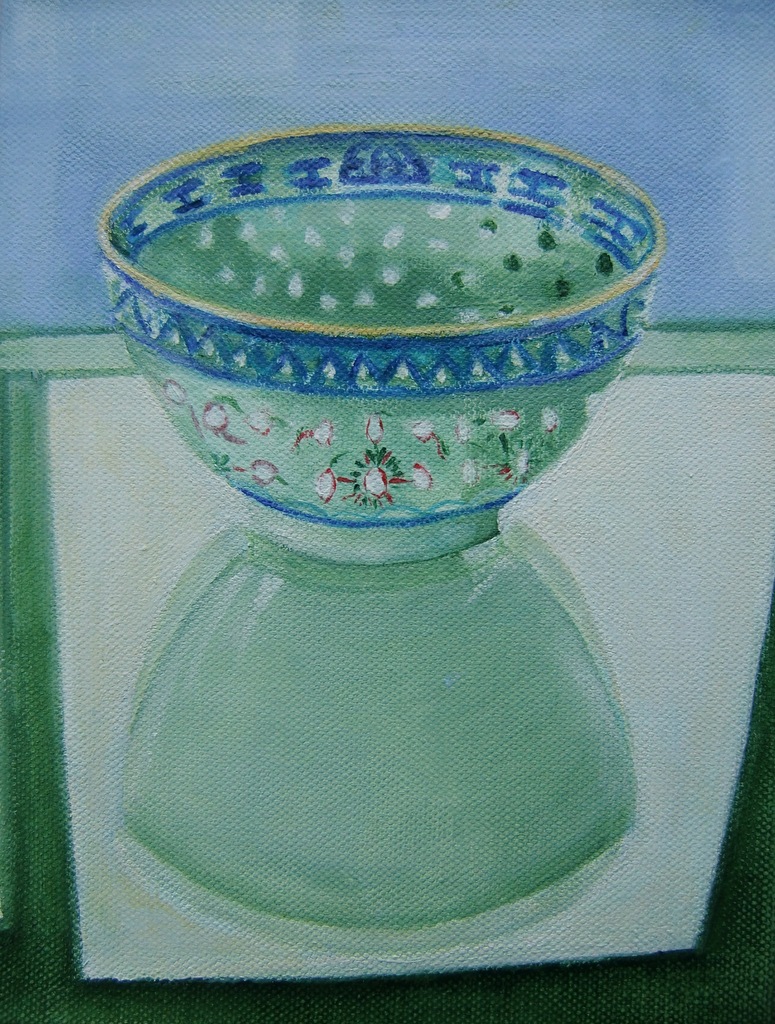 een alledaags rijstkommetje vereeuwigd in acryl