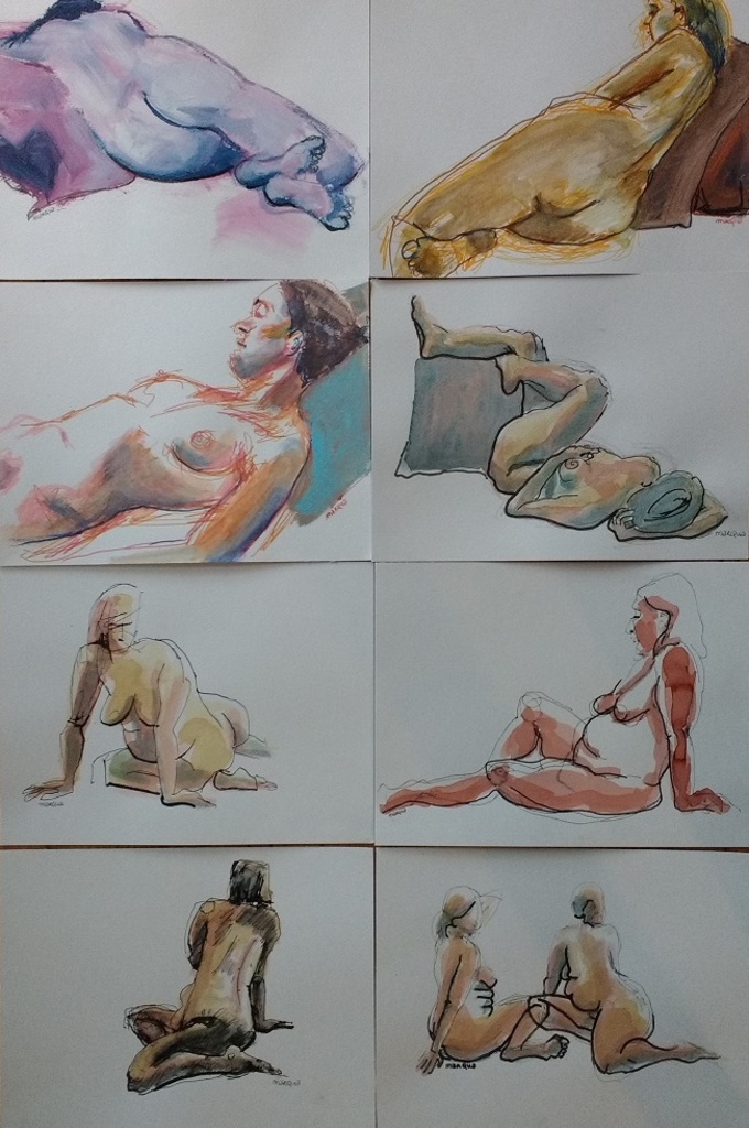 Acht bladen met schetsen van naakte vrouw in inkt en acrylverf op stevig papier 24 x 32 cm. per stuk € 39.