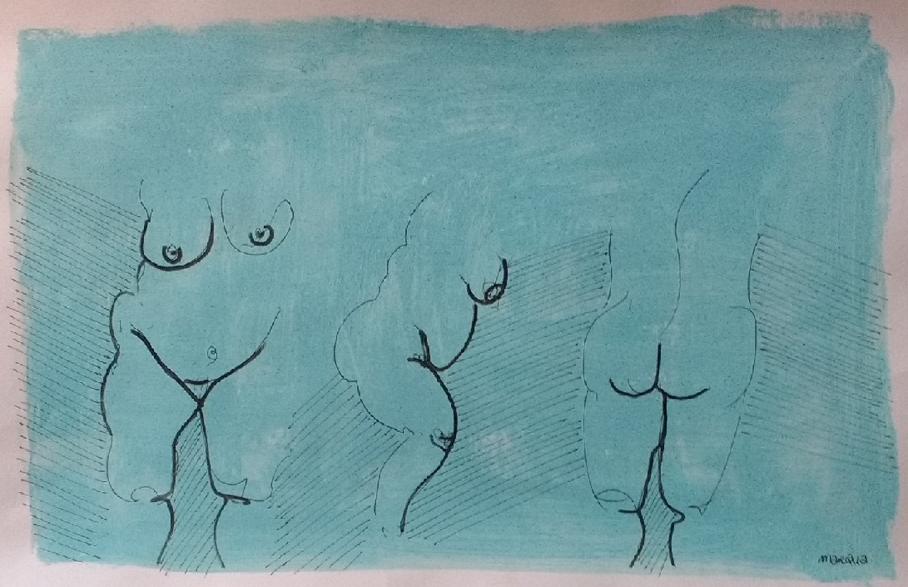 Driemaal Rubens vrouw in blauw op papier 32,50 x 50 cm.