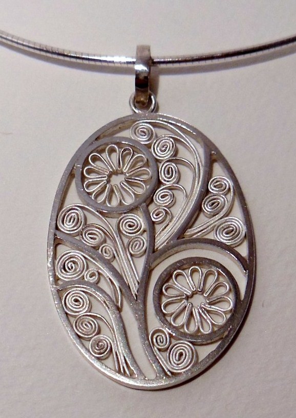 Zilveren filigrain hanger, aan zilveren collier.