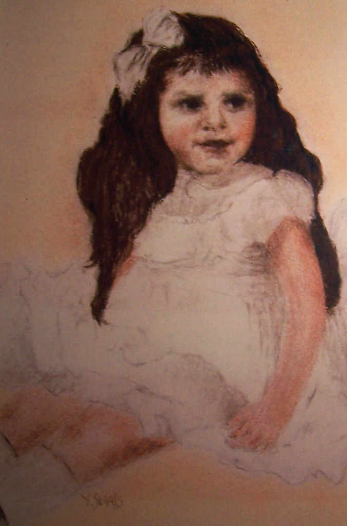 Portret van Rita. Getekend voor haar 50e verjaardag, op dit schilderij is Rita 5 jaar oud. Schilderij in soft pastel en potlood