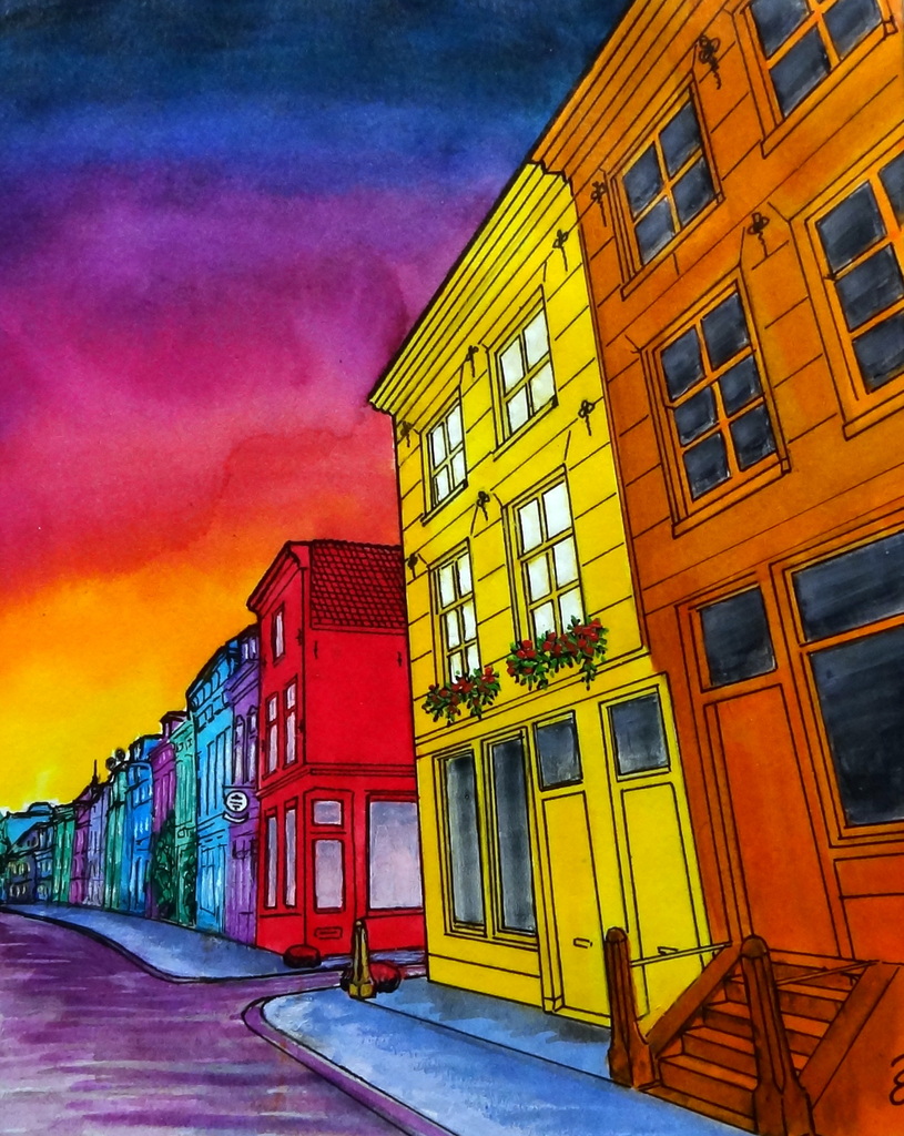 Achter de ramen van het gele huis is het feest. Gemaakt met viltstift, ecoline en acryl.