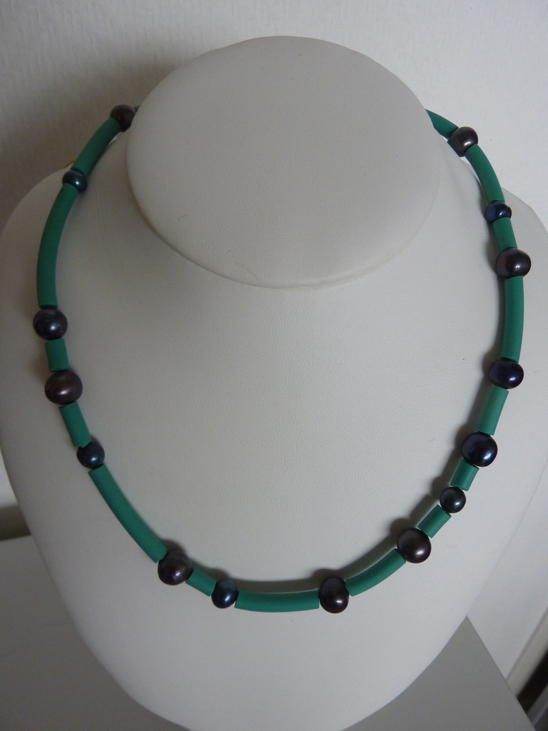 Onverwachte combinatie van zwart-grijze zoetwater parels met groen rubber op gecoat staaldraad