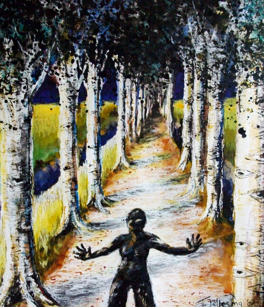 Blinde figuur dwaalt door laan met ziende bomen.