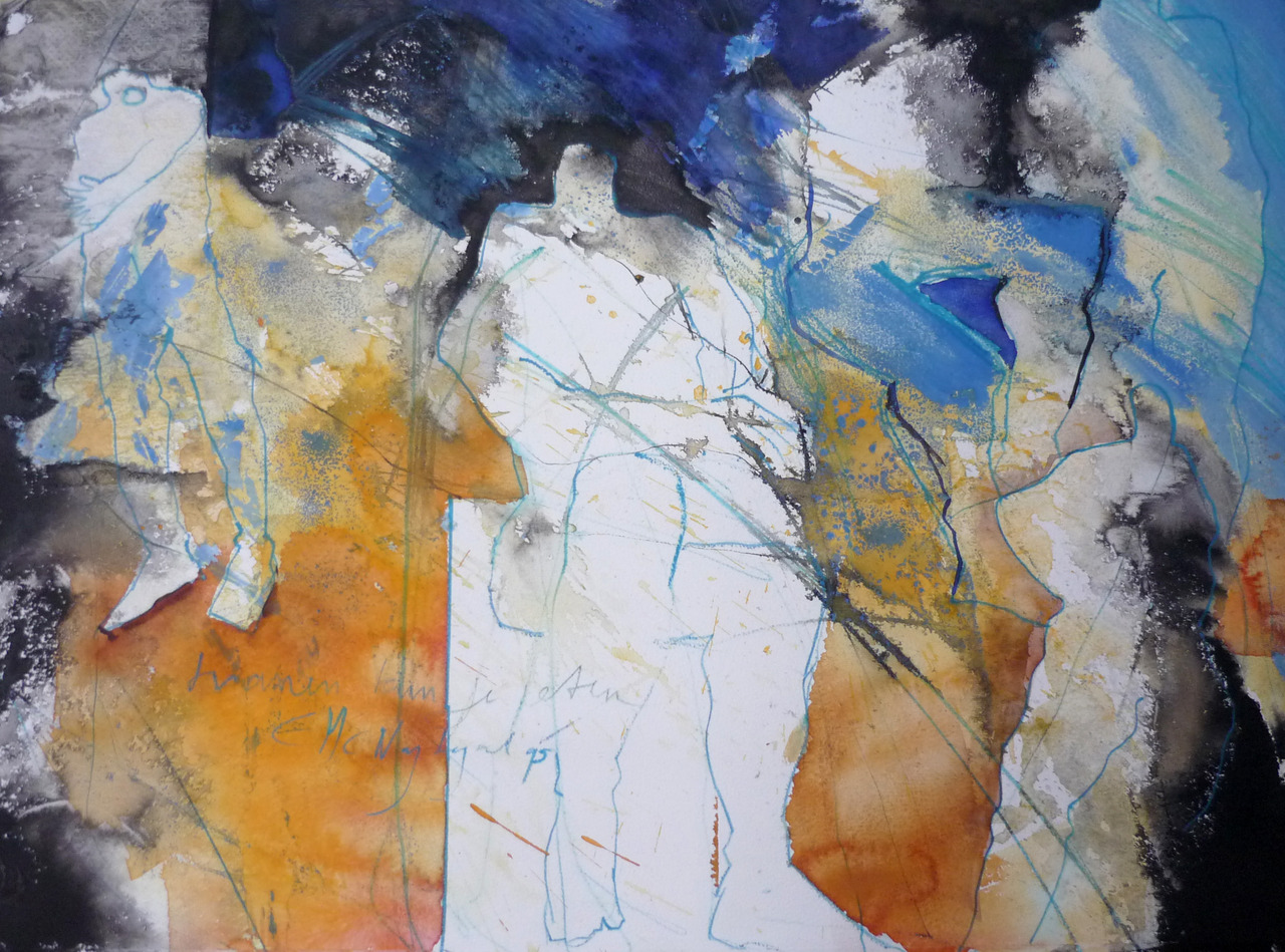 In deze aquarel met gemengde techniek zijn veel figuren te zien ,welliswaar geabstraheerd,maar wel aanwezig. De aquarel wordt geleverd in zuurvrij passse -partout .