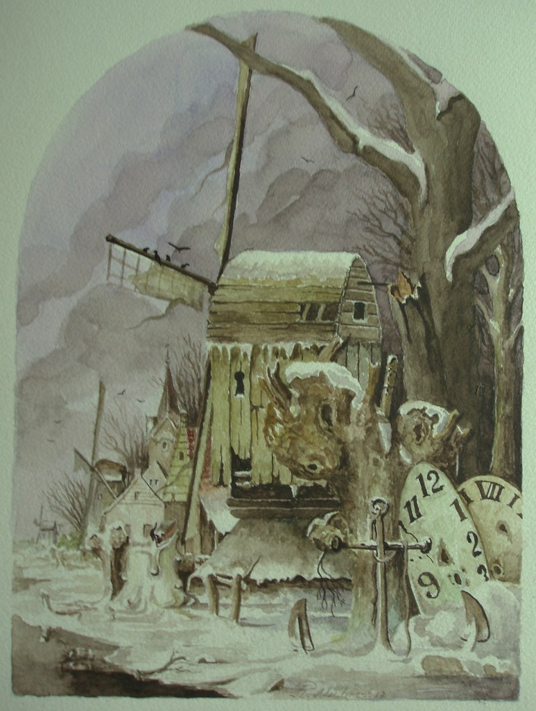 Landschap Romantiek Papier Aquarel Natuur Winter Bos Realisme Fantasie Dorp Tijd Anker Molen Kaars Kerst Kaart Kou Wijzerplaat