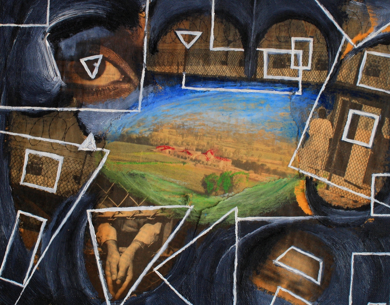 Schilderij, olieverf en mixed media met geometrische vormen en landschap
