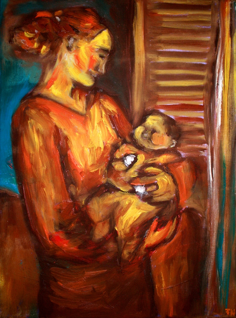 Abstracte en figuratieve olieverfschilderijen, met geometrische vormen, dieren en mensen als terugkerende elementen.