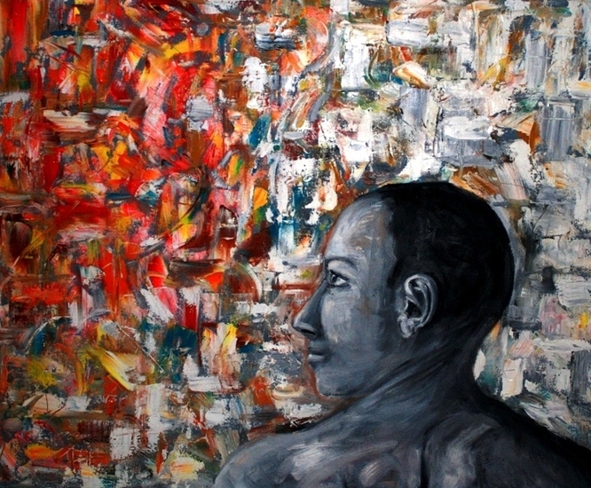 Abstracte en figuratieve olieverfschilderijen, met geometrische vormen, dieren en mensen als terugkerende elementen.