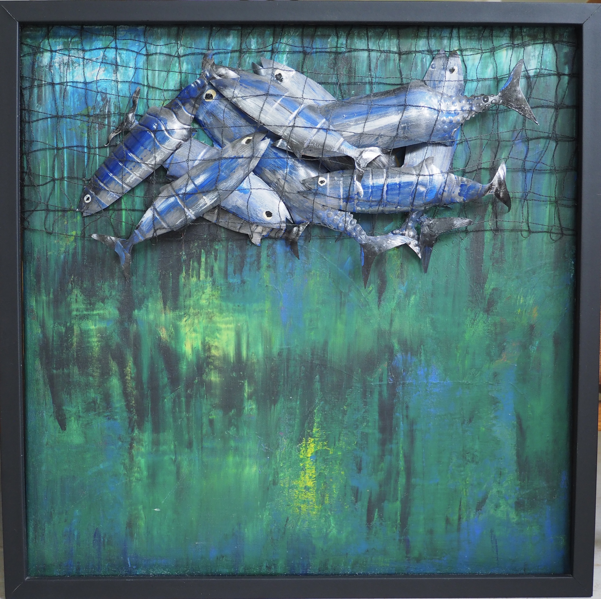 Aanleiding voor dit schilderij (gemaakt van PET-flesjes) was een artikel in een tijdschrift over het op grote schaal leeg vissen van de oceanen. Soorten zoals de blauwe tonijn verdwijnen door overbevissing. De soort krijgt geen kans om zich te herstellen omdat ook de kleine vissen worden gevangen en verwerkt in de voedingsindustrie. Een oneerlijke strijd tussen de mens en het dier.