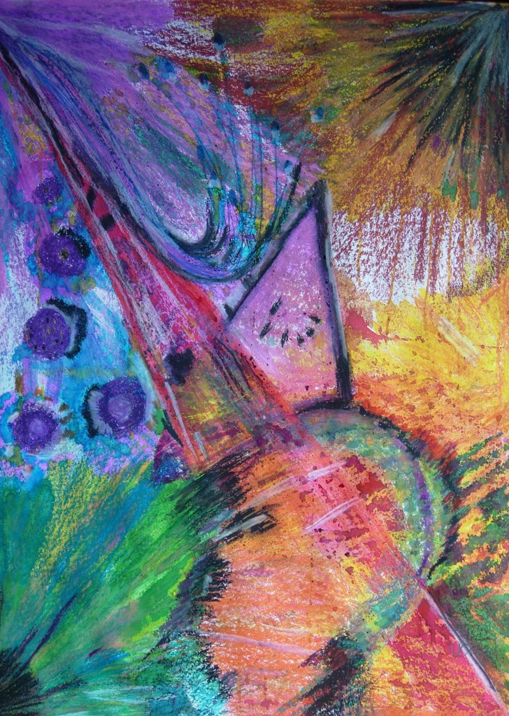 Intuïtief schilderend, figuratief en abstract met verschillende technieken. Reflecterende wisselwerking tussen kunstenaares en het doek leidt uiteindelijk tot interessante composities.