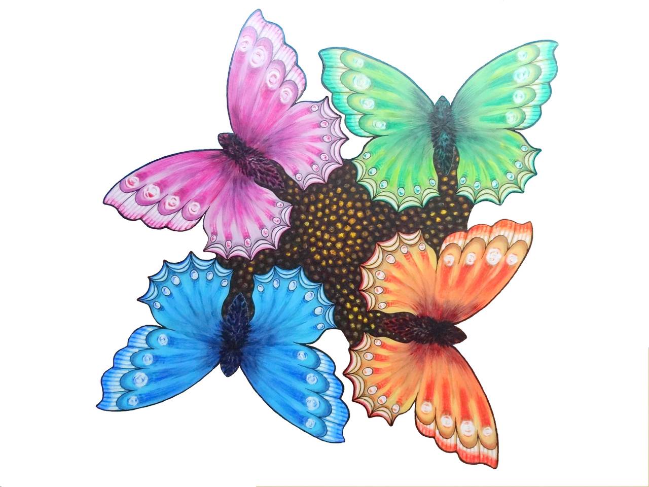 Vier kleurige vlinders op een paneel in de vorm van de vlinders.