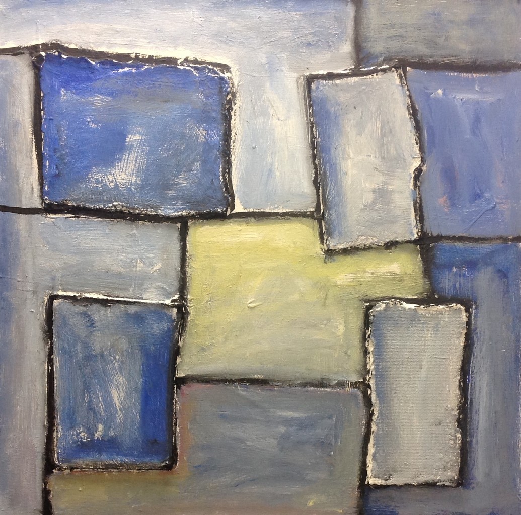 Een vierdelige serie over de kracht van blauw. Collage (hardboard op multiplex). 72 x 72 cm (incl. 5 cm brede witte kozijnlijst).
