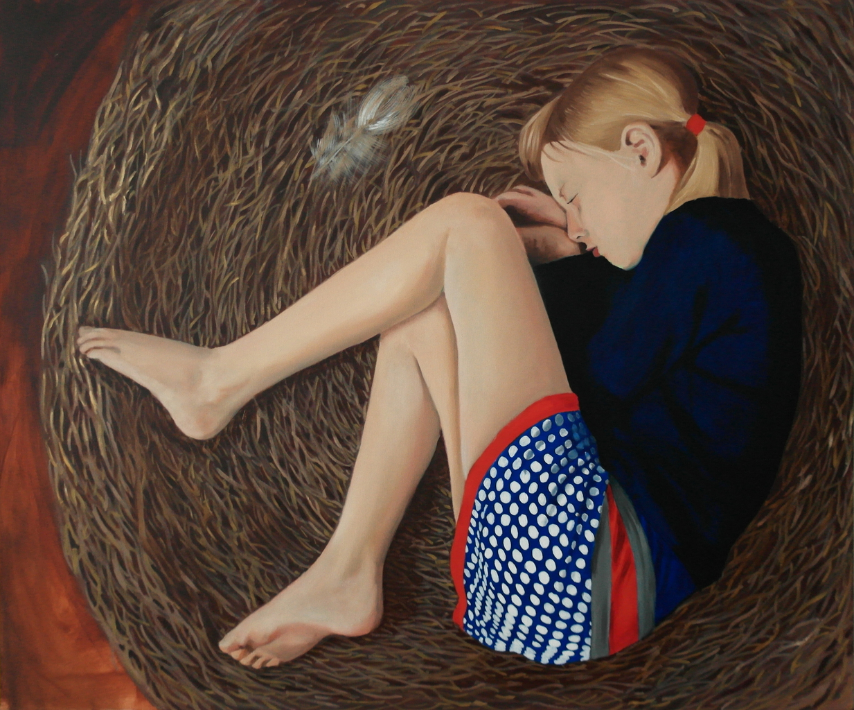 Kind in een nest. Verbeelding van bescherming, beschutting en opgroeien.