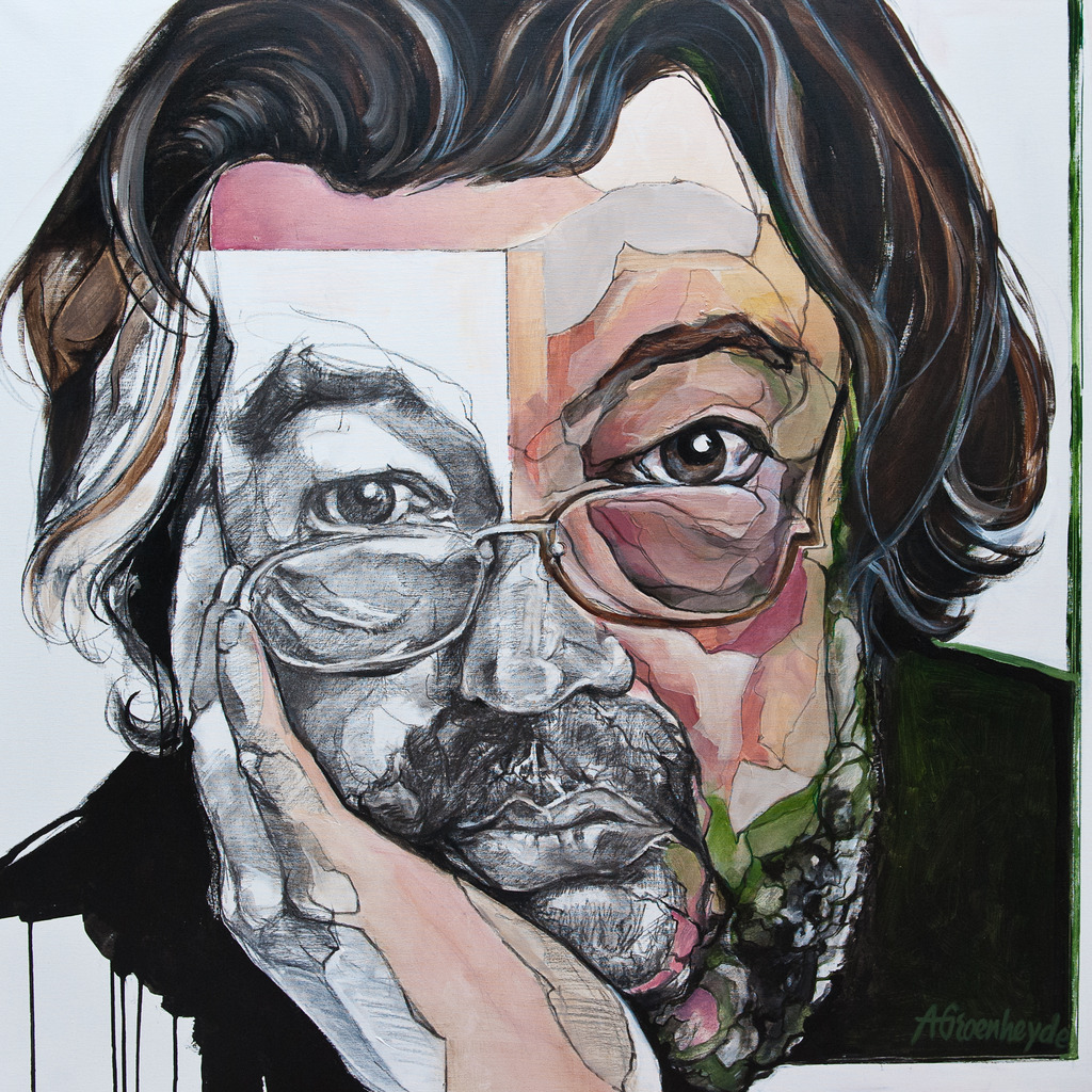 Een portret van M van Rossum in houtskool en acryl op doek