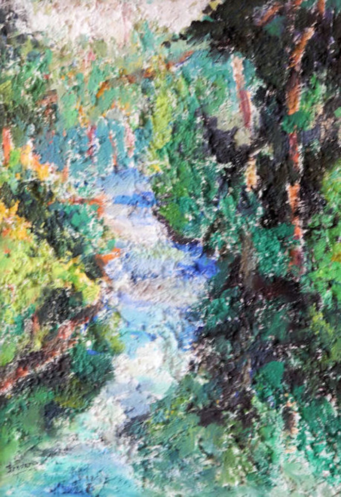 beek in het bos, op paneel geschilderd met strucruur en lijst van mdf; formaat iclusief lijst