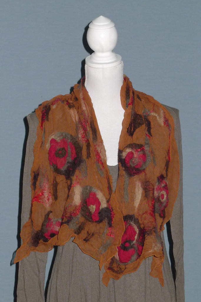 Lichtbruine sjaal, met bruine wol opgevilt. Tussen de wol zitten ook highlits van rood zijde.