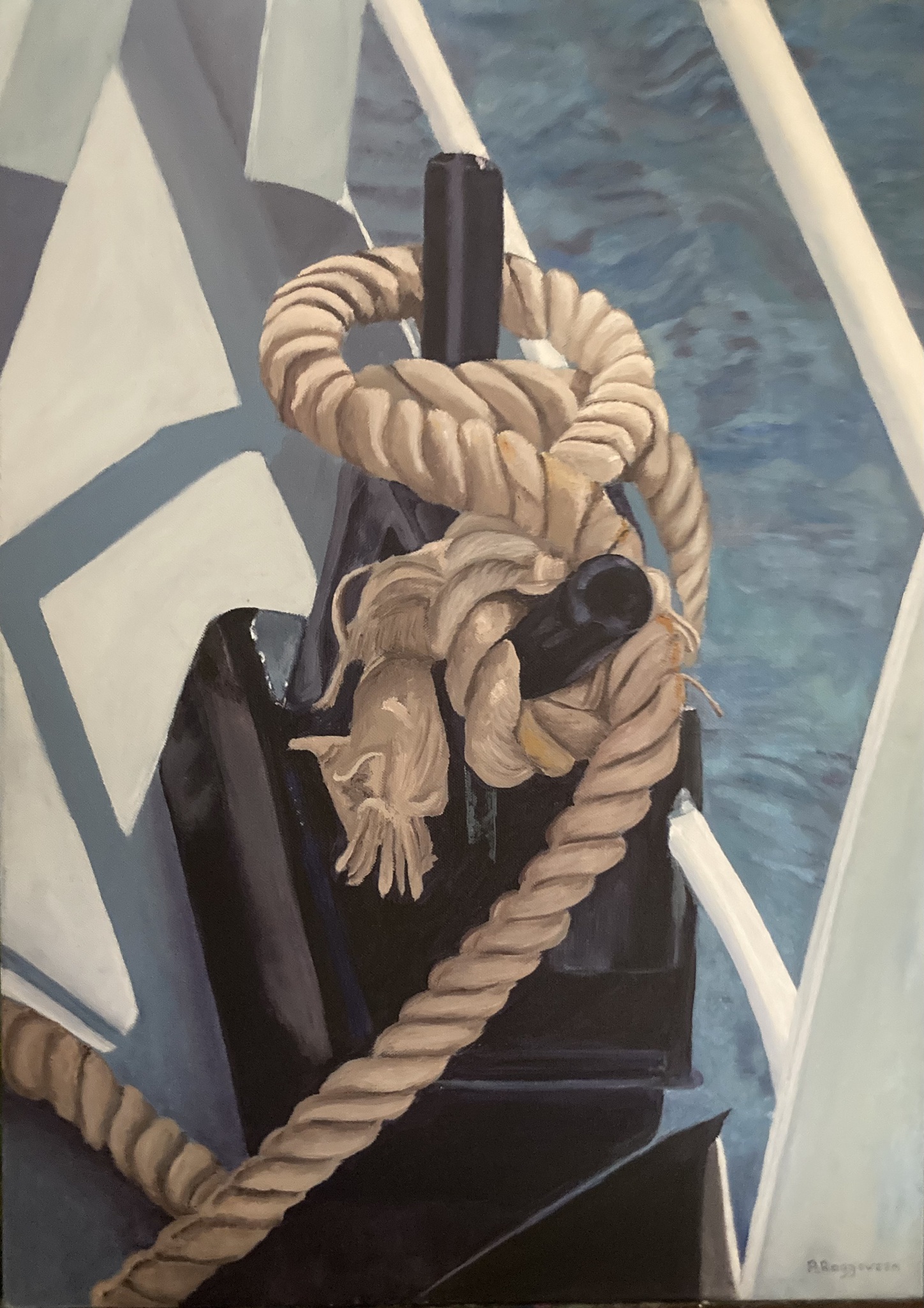 Mooie foto,s gemaakt op een boot, en daar een schilderij van gemaakt. De boot was op tijd aangelegd met dikke touwen.