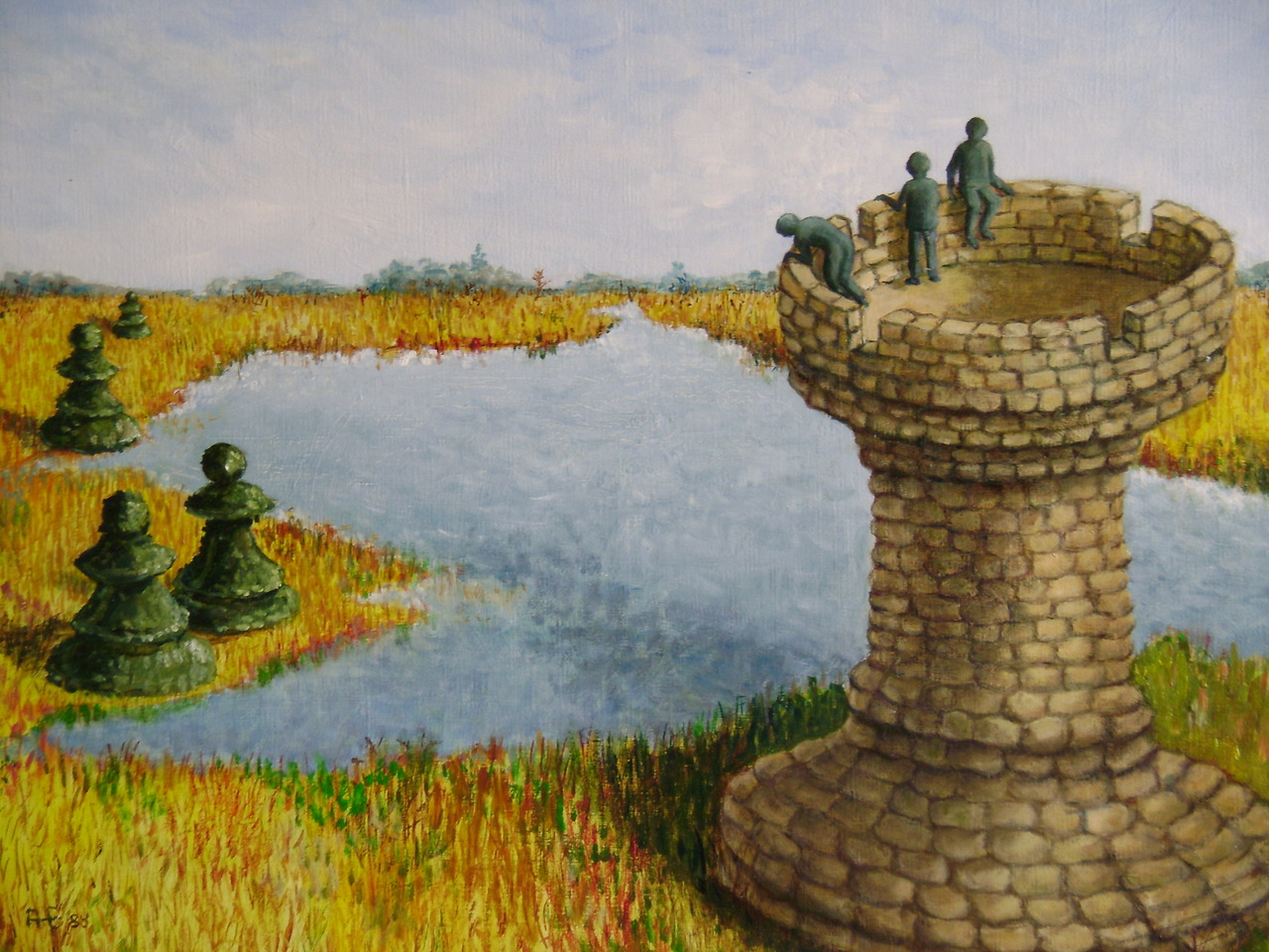 Polderlandschap voor schaakstukken. Overzicht vanaf de toren op de uittocht der schaakpionnen.