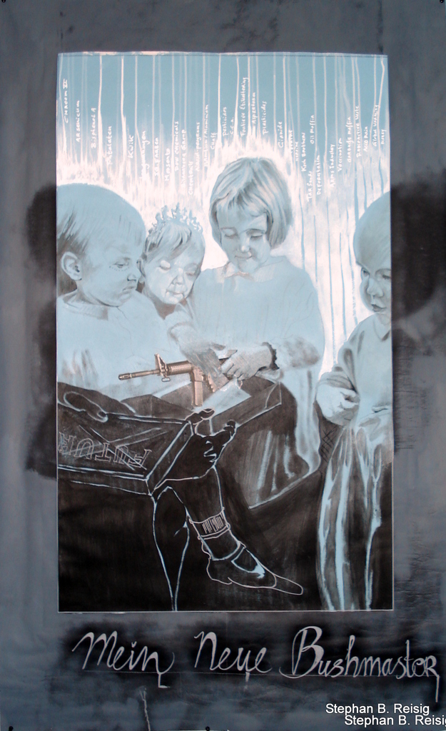 Dit werk Mein Neue Bushmaster (2013) gaat over het ontverantwoord gedrag van volwassenen jegens kinderen.