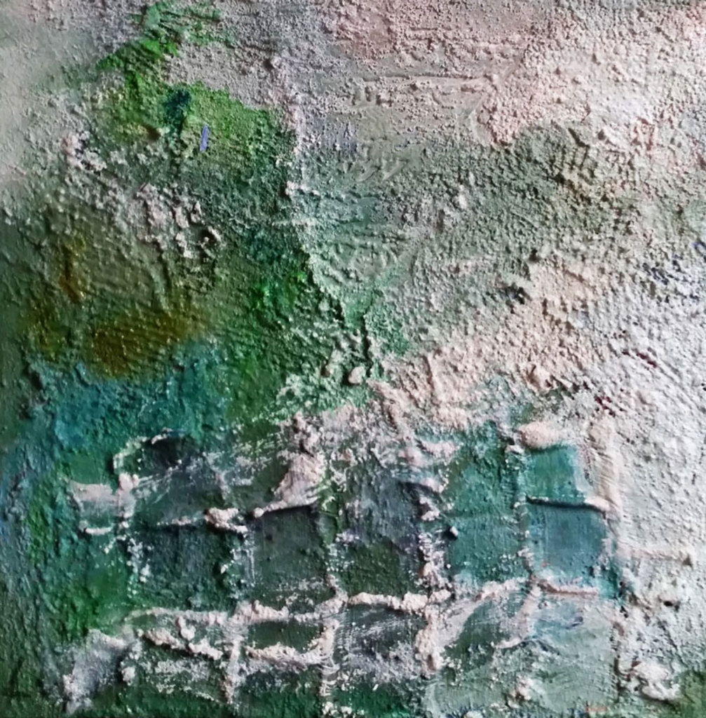 Iets in de buitenwereld intrigeert mij en door deze impressie uit te werken wordt zij blijvend deel van mijn binnenwereld. Laag na laag bouw ik aan de uiteindelijke vorm. Tijdens het werken komt er een stroom van associaties op gang. Het is een constant zoeken naar evenwicht tussen de verf en de andere materialen.