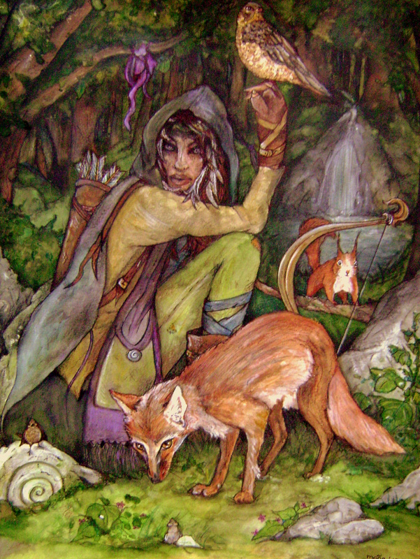 De vrouwe van het eeuwenoude Woud omringt door haar reisgezellen; de vos, eekhoorn, valk, muis en merel