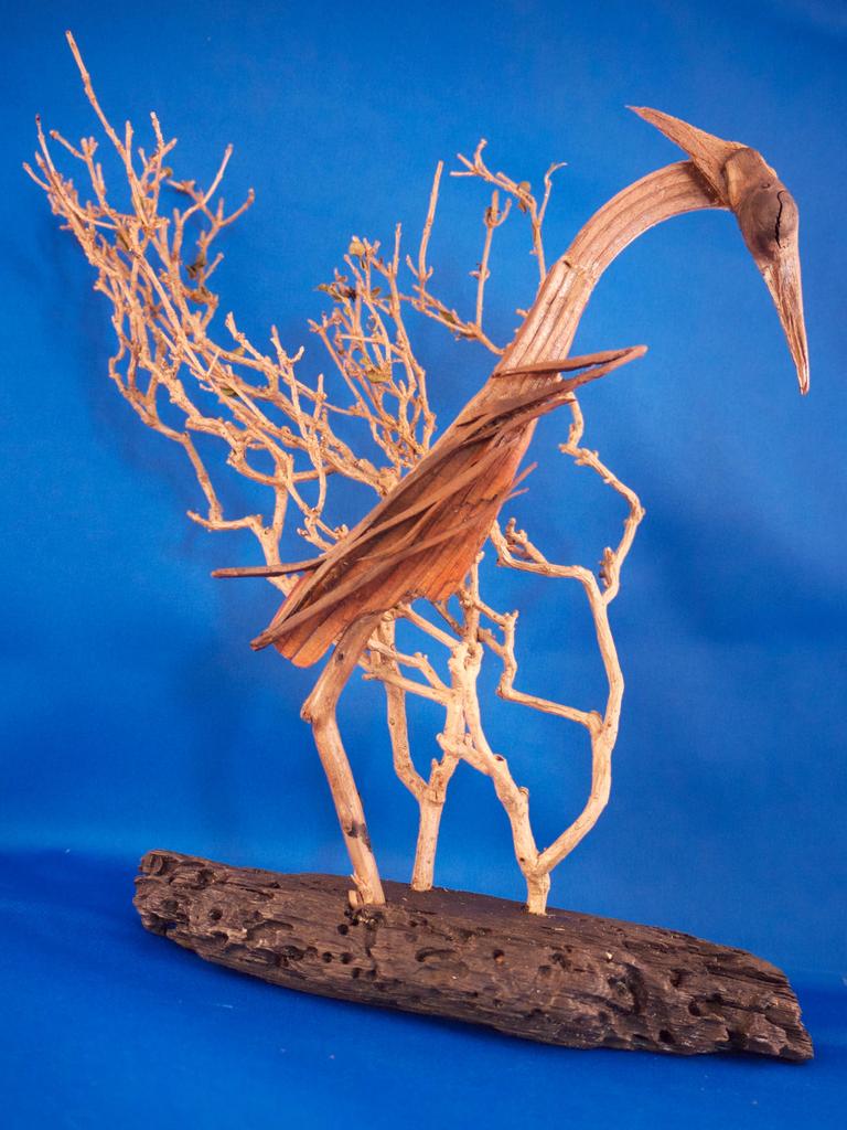 Een vogel symboliseert de spiritualiteit en de vrede. In het oude Rome golden vogels als middelaars tussen de goden en de mens. Zo werd bijvoorbeeld de vlucht van een vogel bestudeerd om aan de hand hiervan voorspellingen of conclusies te trekken over wat de wil van de goden zou zijn. Simone maakt meervoudig een Reiger als kunstwerk. In de Boeddhistische cultuur is de reiger het symbool voor zuiverheid en intuïtie. In de Christelijke cultuur staat de reiger voor 'goed gelovige'. Zijn bed en eten zijn op dezelfde plek. In de tijd van de Farao's was de reiger het symbool voor vernieuwing. Ook staat de reiger symbool voor zwijgzaamheid, meditatie en evenwicht. Gemaakt van onbewerkt drijfhout.