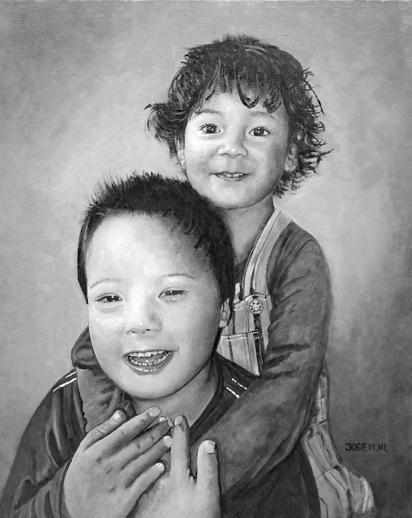 Arwen en Viggo in grijstinten in olieverf op waterbasis.