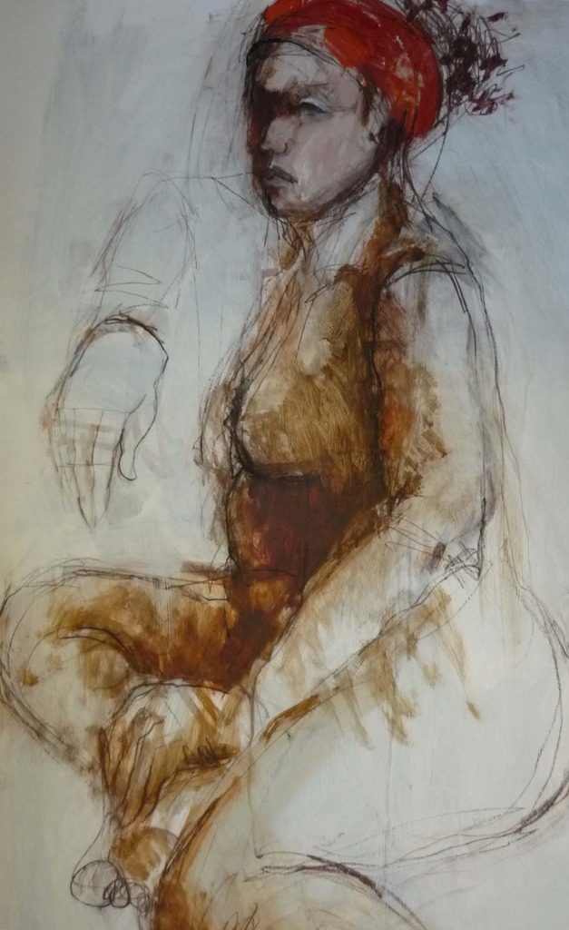Vol Naakt Model Schilderij Met Ook Tekening Rode Haarband Gebrande Siena