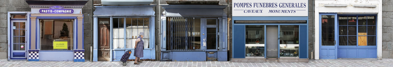Een winkelstraat in een dorp in Frankrijk die bijna aan het einde van zijn levenscyclus is.