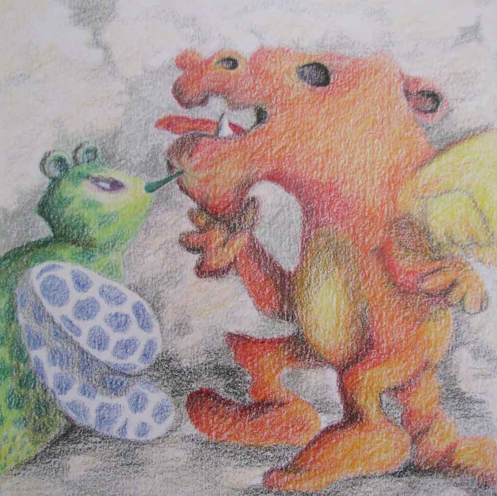 Auw...schreeuwde de draak! Gemeen prikbeest! Vertaling, van een keramiek tegel met een interessant vlekkenpatroon, naar een tekening in kleurpotlood.