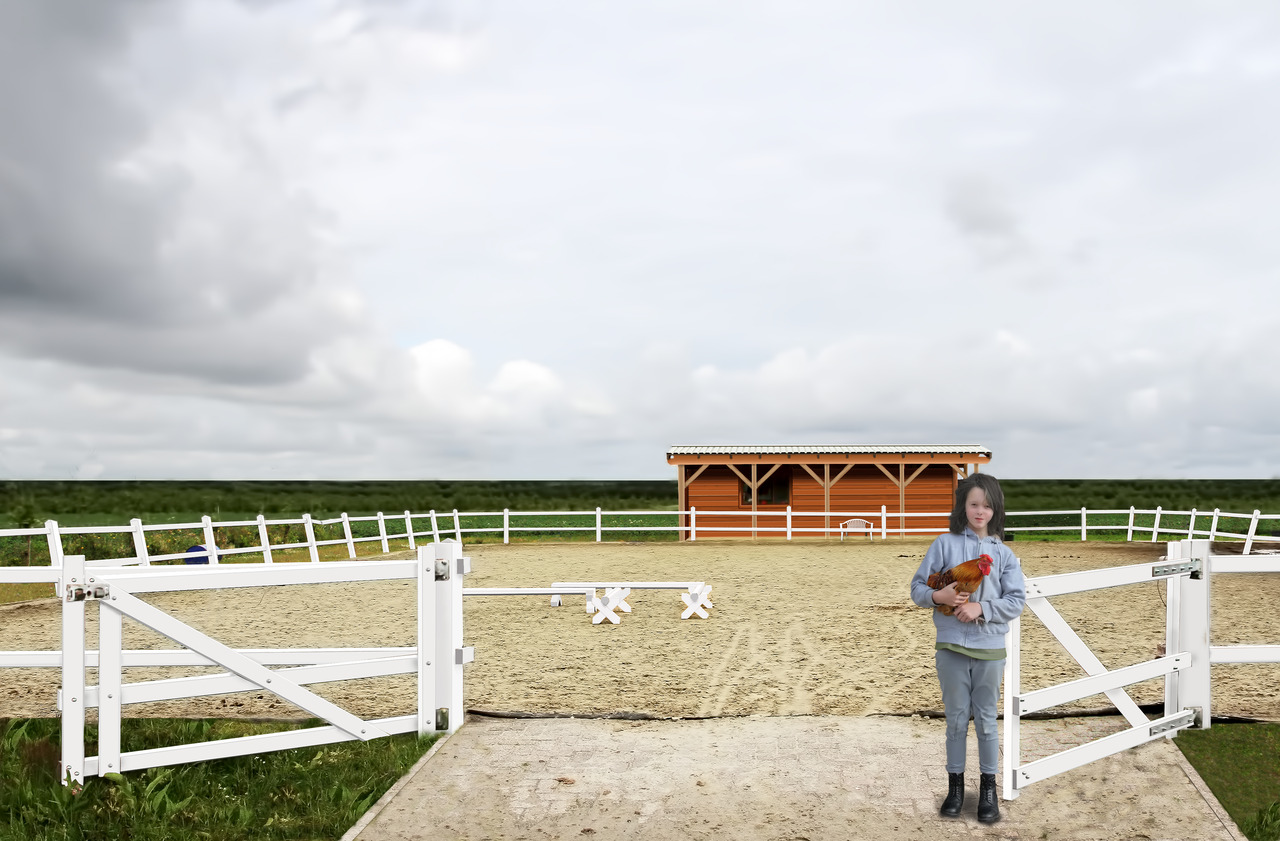 het paardenmeisje poseert voor een lege bak met een haan in haar armen