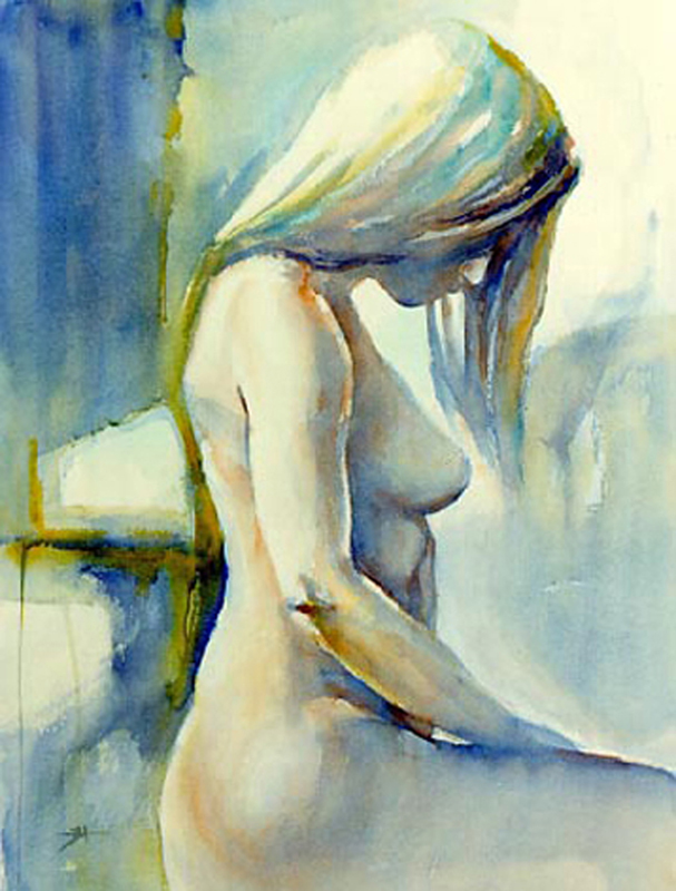 Geel Blauw Groen Vrouw Naakt Aquarel Ingetogen